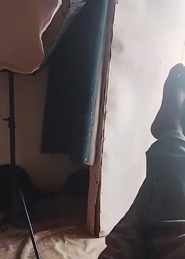 person in green pants with bare feet resting near a partially obscured light stand. The stand has a white fabric screen to the left of a dark-colored backdrop positioned against a white wall. The person's legs are stretched out in the foreground, and their bare feet are visible in the upper right of the frame. The background includes the light stand and backdrop, which are situated next to the white wall. The lighting conditions make it difficult to discern further details, but the scene appears to be set indoors.