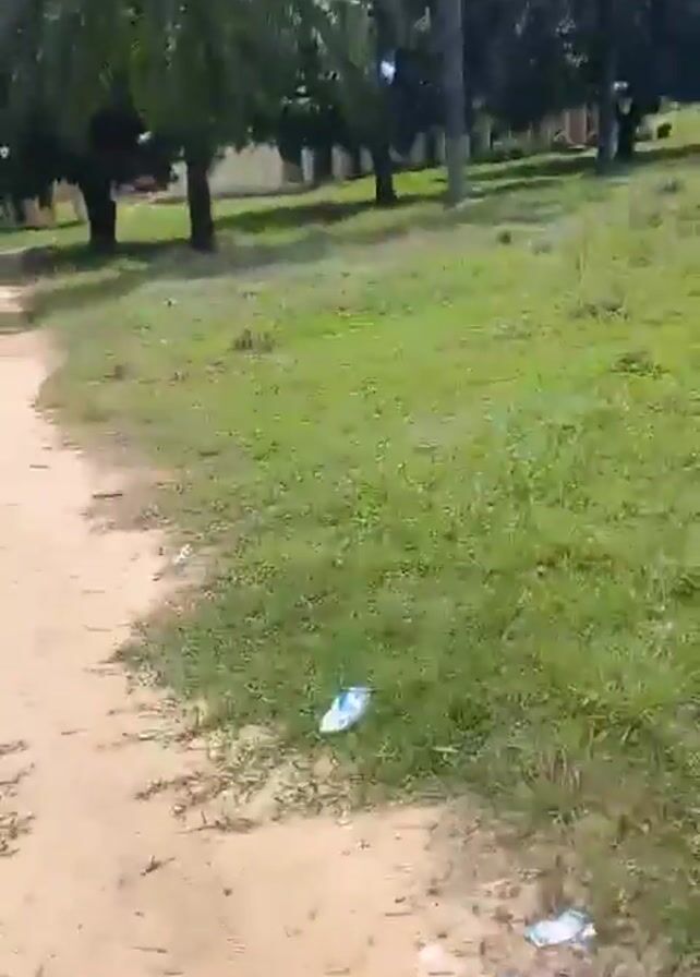 A video shot outdoors from a moving perspective depicts a sandy path flanked by green grass. Litter is visible near the path. As the video continues, palm trees come into view. The landscape transitions into a grassy area dotted with more palm trees. Eventually, a building is revealed in the distance. The building appears to be one story and features a light-colored facade with windows.