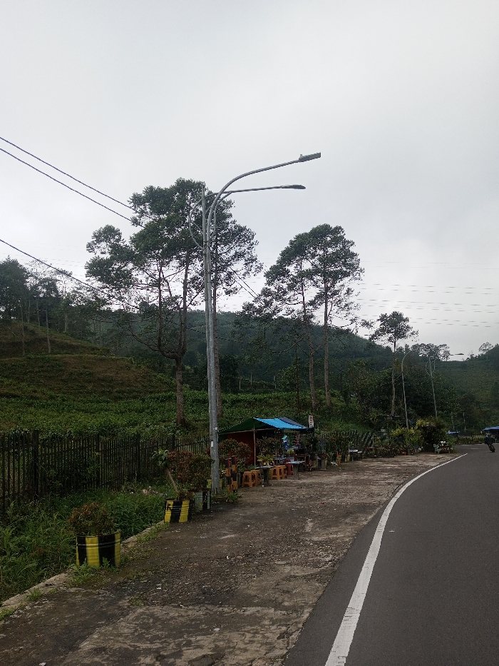 A roadside view features a gray street with a white line dividing it. A metal fence runs along a grassy slope dotted with green vegetation. Trees of varying heights populate the background, set against a cloudy sky. A small structure with a blue roof sits along the street, accompanied by a series of small tables and potted plants. A silver streetlight stands tall near the roadside.