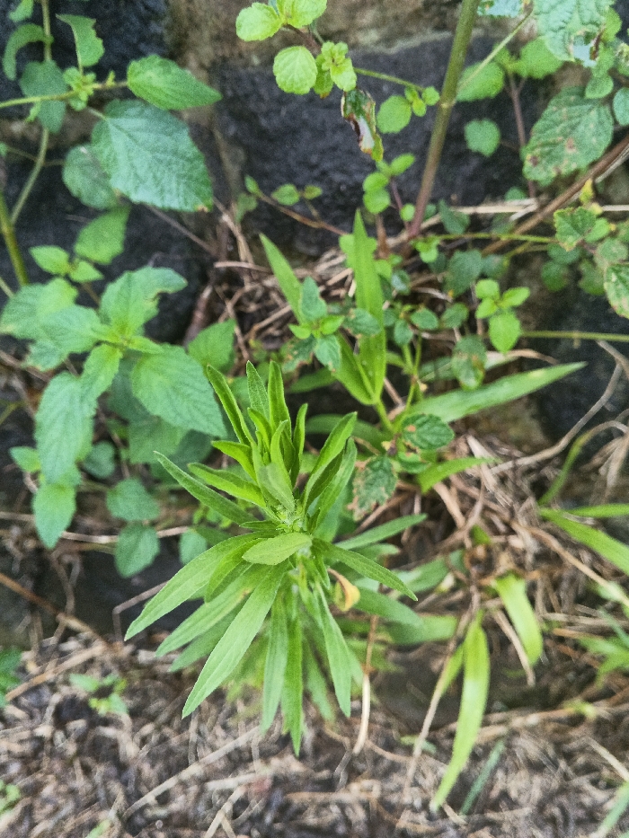 The image presents a close-up, high-angle view of dense green foliage growing on dark soil. A central plant with numerous elongated, pointed, light-green leaves forms the primary subject in the foreground. Surrounding and behind this plant are various other green plants with broader, rounder leaves, some exhibiting serrated edges, and darker green hues. Scattered across the ground are dried brown plant stalks and leaf litter. A dark, textured surface, possibly a stone wall or damp earth, is visible in the upper background. No human figures or man-made objects are identifiable. The scene depicts natural vegetation in Kwekwe, Zimbabwe.