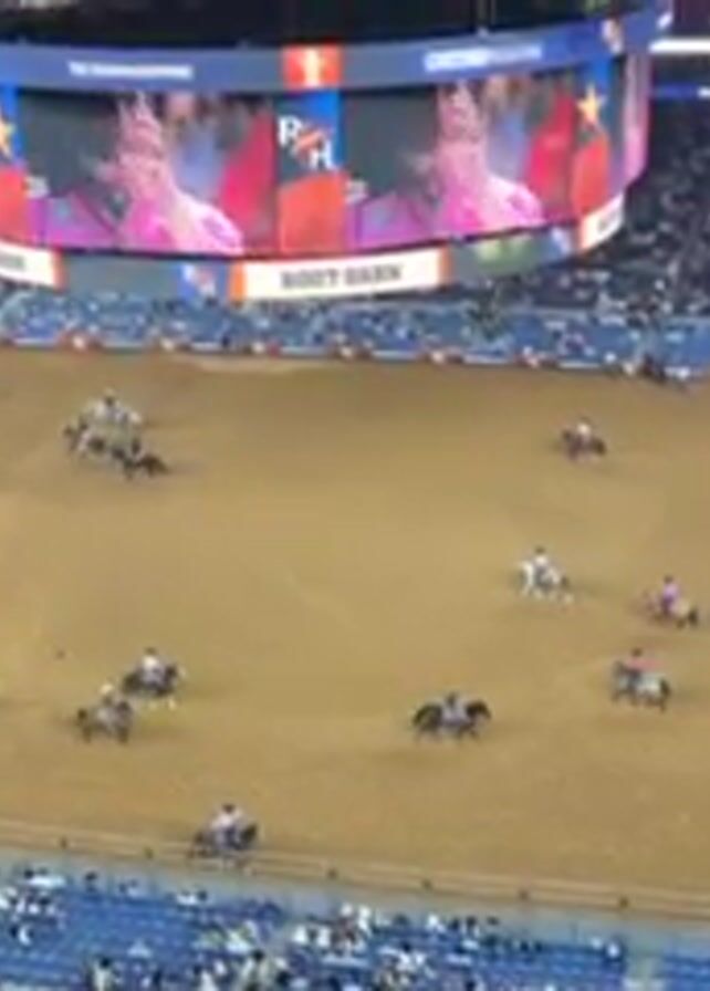 rodeo arena with several riders on horseback practicing their skills. The arena is filled with dirt, and the riders are spread out across the space. Overhead, a large screen displays an image of a young man, possibly a competitor. The arena is surrounded by seating, and the stands are filled with spectators.