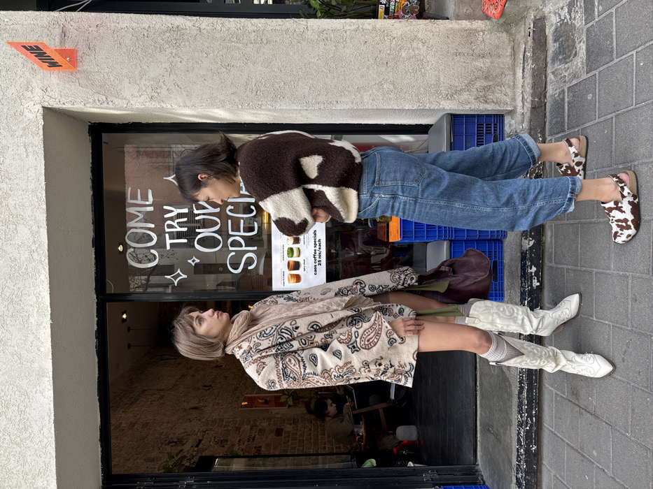 Two women stand in front of a shop window with white writing. One wears a brown and white cow-print cardigan, jeans, and cow-print clogs. The other wears a paisley jacket, light-colored scarf, and white cowboy boots. A purple bag rests between them. The storefront has a sign that reads "WINE" and advertises coffee specials. A brick wall and people are reflected in the shop window.