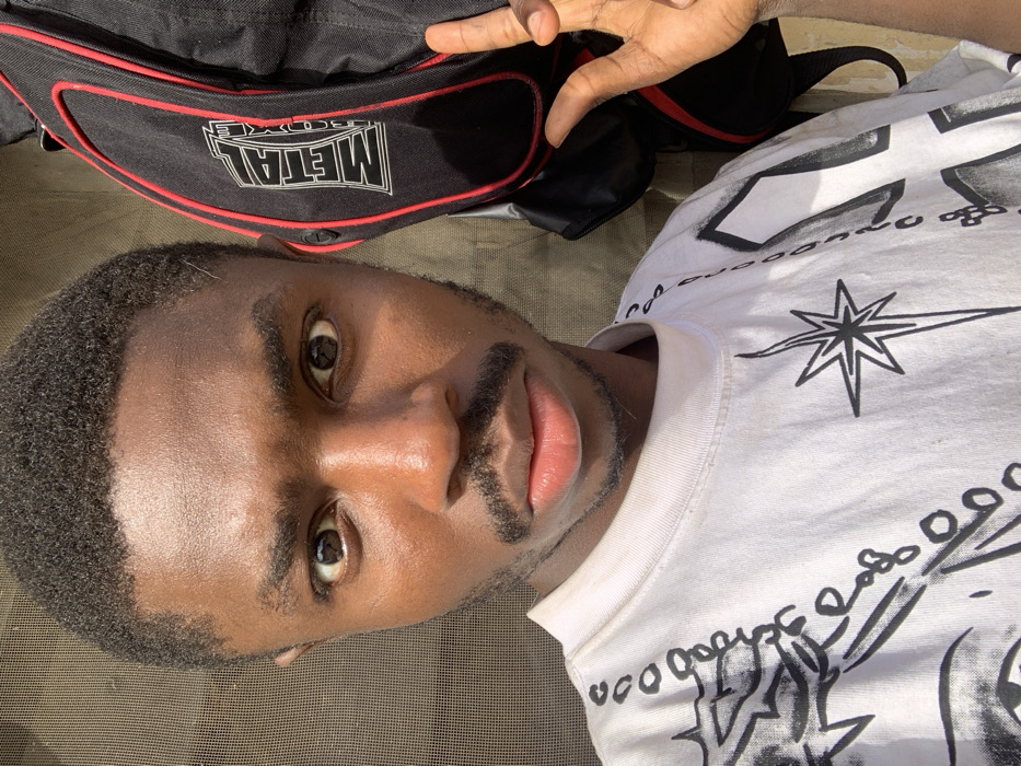 A dark-skinned man with short, dark hair and a thin mustache lies sideways. He wears a white t-shirt with black designs, including a starburst pattern. A black bag with red trim and the word "METAL" is visible in the background. The man's eyes are open, and his face is well-lit. A hand is positioned above the bag, partially obscuring it.