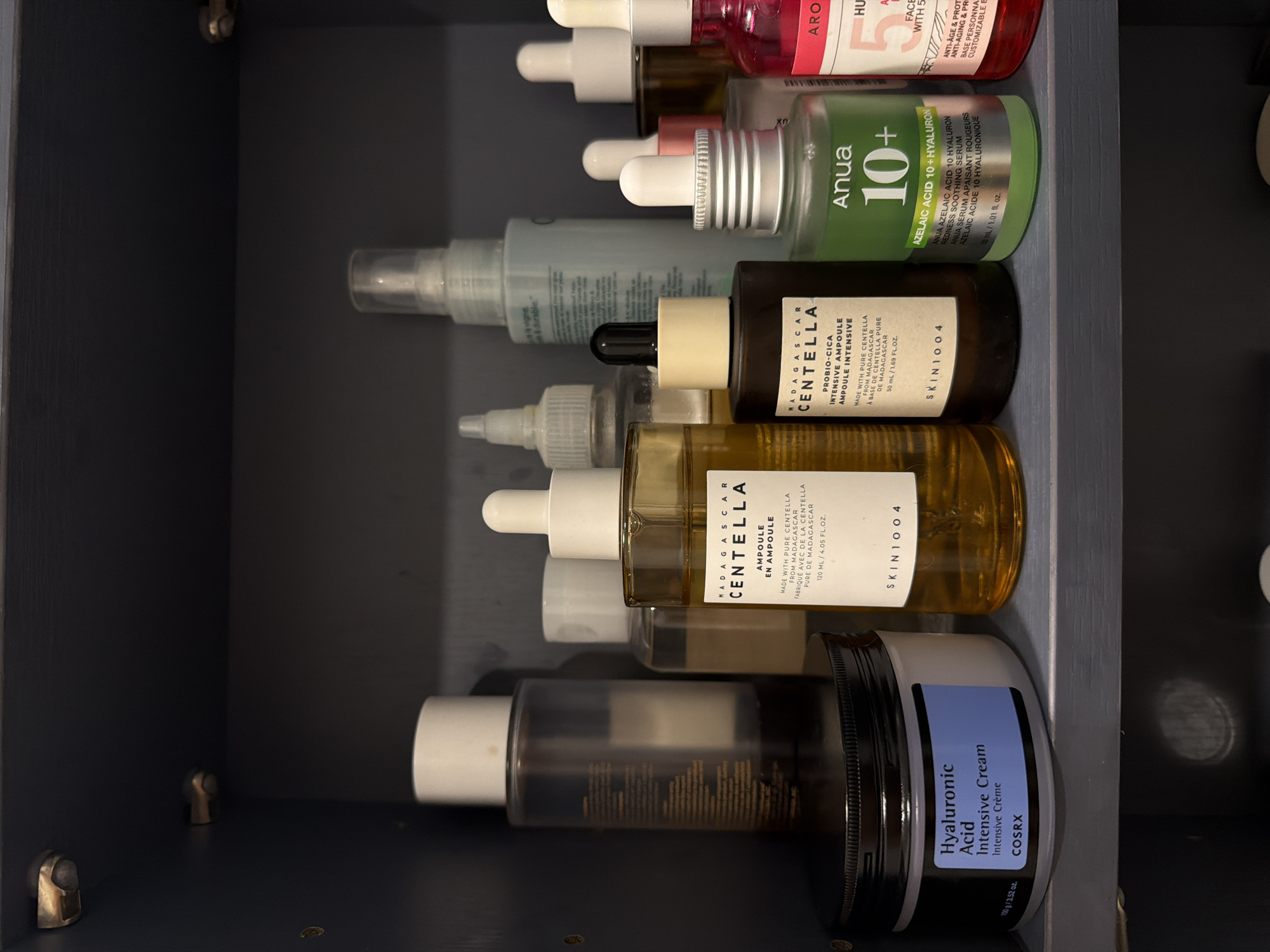 A top-down shot reveals a shelf within a cabinet, stocked with various skincare products