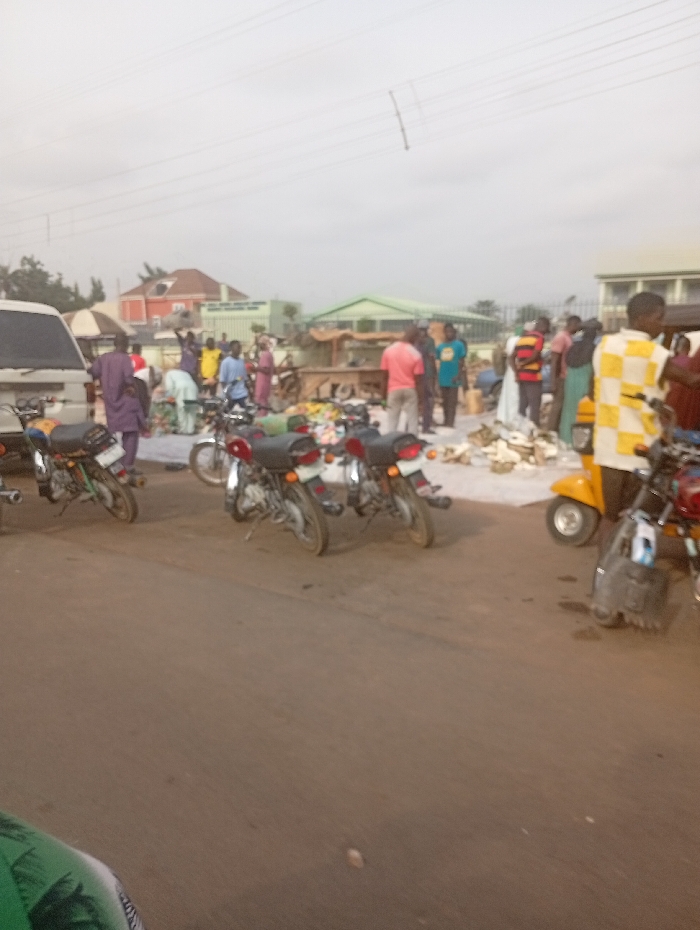 A street scene in Nassarawan Eggon, Nigeria. There are a number of motorcycles parked in the street, including a yellow auto-rickshaw. A crowd of people are gathered nearby, some of whom are standing by a food vendor. Several buildings are visible in the background, including a small, light-colored building with a red roof. An SUV is parked at the left edge of the frame, with its rear end partially obscured. The street is dirt and appears to be dry. The sky is overcast.