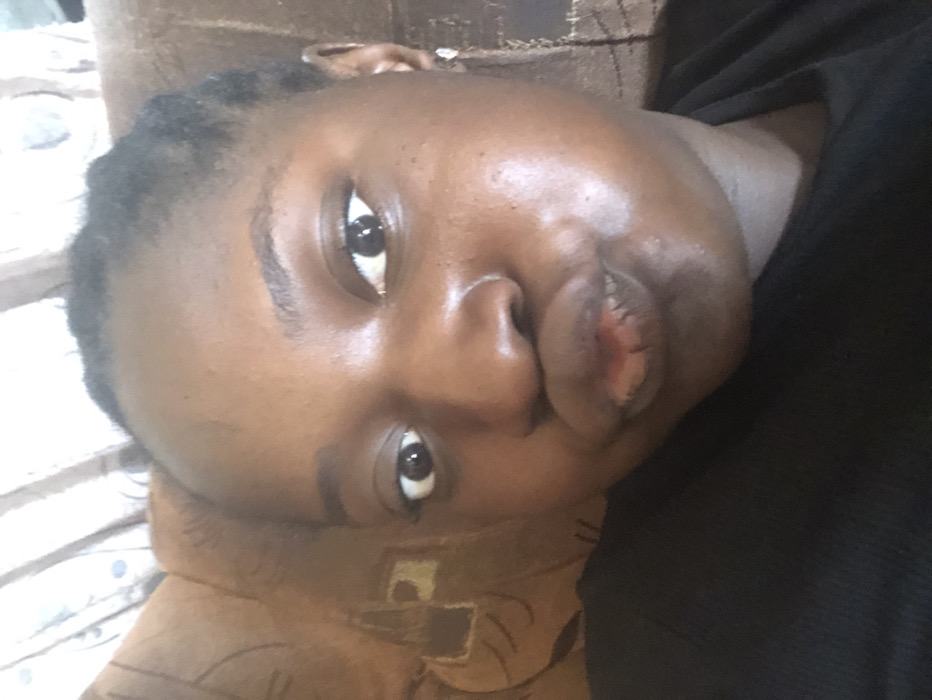 A close-up, front-facing image depicts an individual with dark skin, assumed to be an adult female, in an indoor setting within the city of Rido, Nigeria