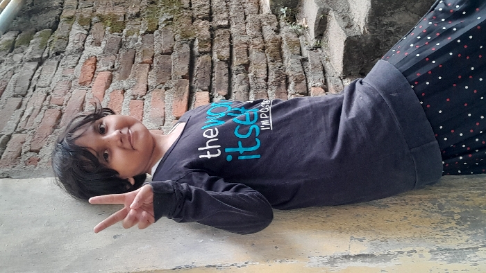 A single young individual, a child, is depicted in an outdoor setting in Lhokseumawe, Indonesia. The individual, visible from the torso upwards, wears a dark long-sleeved shirt with white and blue lettering; "the wor" appears in white text, and "itself" in blue. Below the shirt, a dark skirt patterned with white and red polka dots is visible. The individual leans against a light-colored, weathered plastered wall on the left. Their right hand is raised, forming a 'V' gesture near their face, and they exhibit a subtle smile directed towards the viewer. The background on the right consists of a weathered reddish-brown brick wall with visible mortar and sparse plant growth. Adjacent to the brick wall, in the lower right, are weathered concrete steps or raised elements.