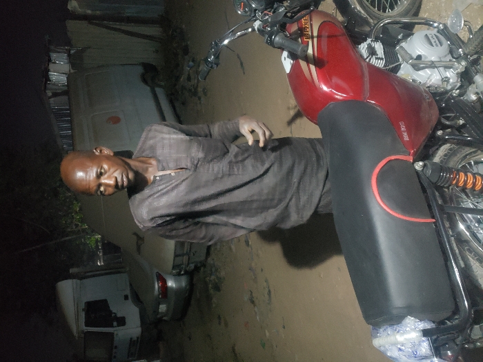 A man with a shaved head stands next to a red and black motorcycle. He wears a patterned brown shirt. The motorcycle has a black seat with red trim, a red gas tank, and silver engine parts. Two white vans and a silver car are parked in the background. The lighting is dim.