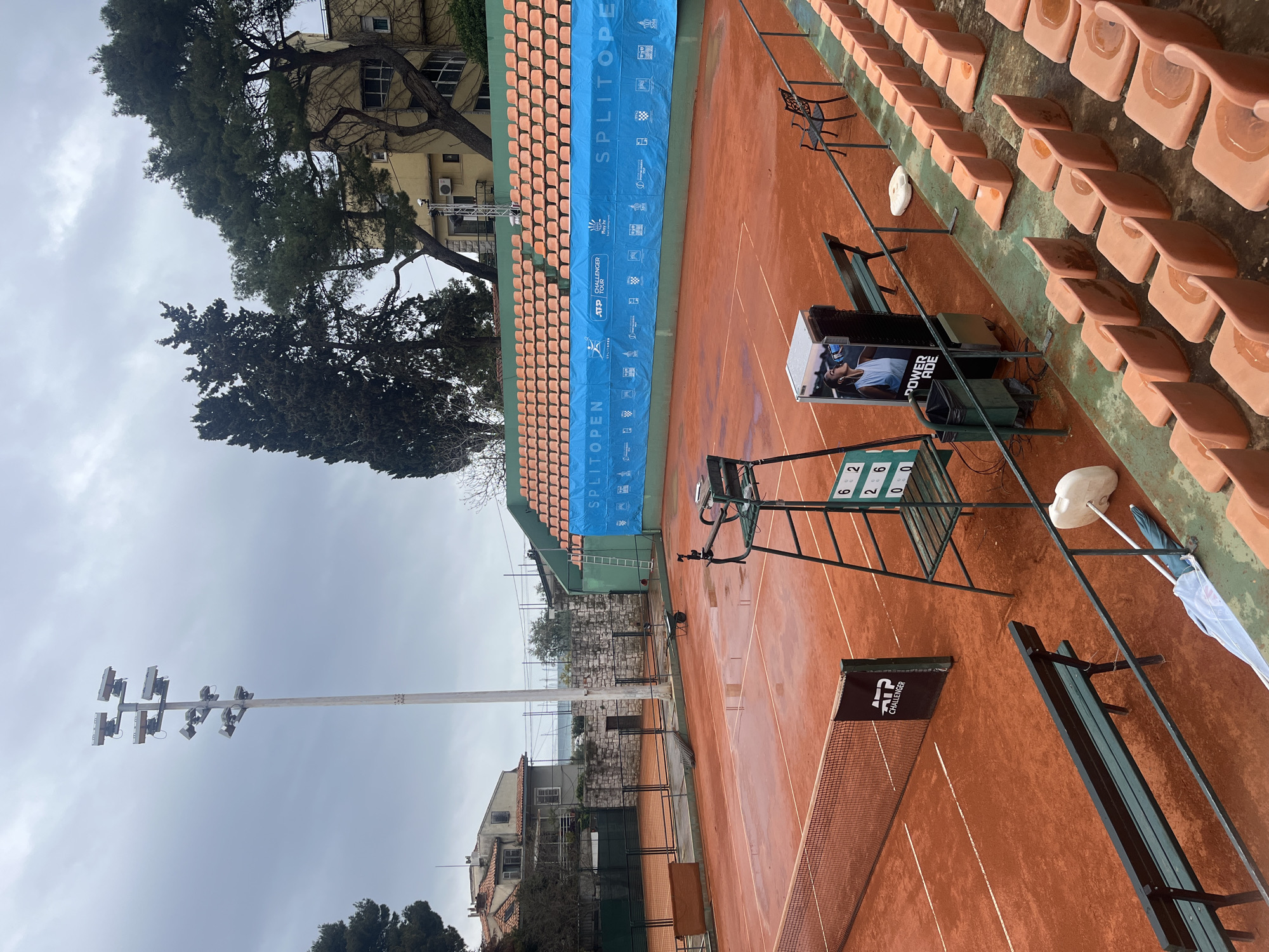 - "This image captures an empty outdoor clay tennis court and stadium, located at what appears to be the Gripe tennis center in Split, Croatia, identifiable by the "SPLITOPEN" and "ATP Challenger Tour" branding on the advertising banner" by FM-sD3uf1, licensed under CC BY 4.0