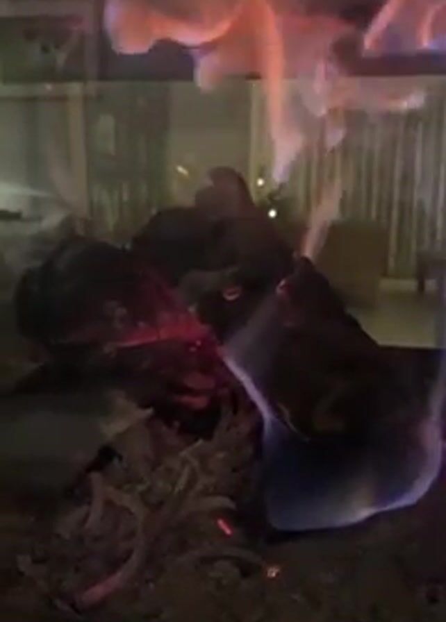 fireplace. The glass door is opened, revealing a pile of logs and ashes. The logs are glowing red and black, but the flames have died down. The room can be seen in the reflection on the glass, with a painting on the wall, curtains, a wooden dresser, and a Christmas tree in the background.