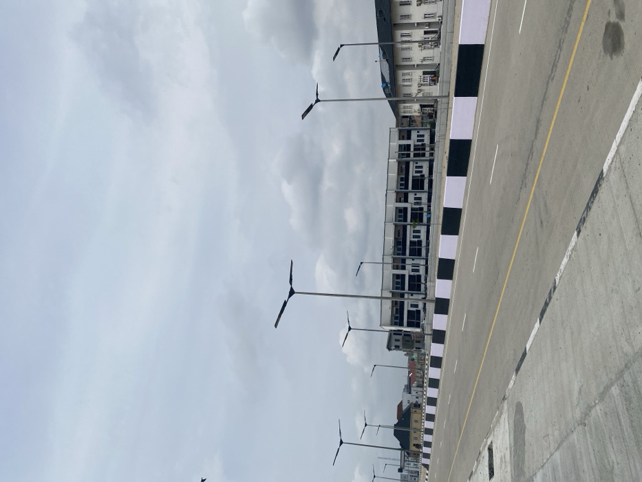 The image depicts a wide, multi-lane concrete roadway located in Alaguntan, Nigeria, under an overcast sky. The road features clear white solid edge lines, dashed white lane dividers, and a solid yellow center line. A series of uniformly spaced modern streetlights, each with a flat, dark, rectangular fixture, line the right side of the road and extend into the distance. Parallel to the roadway on the right, a concrete median barrier is painted in alternating black and white rectangular blocks. Beyond this barrier, a complex of multi-story buildings is visible; these include a continuous block of two-to-three-story structures with white facades, numerous dark-framed windows, and balconies, some exhibiting scaffolding indicative of recent construction or development. Further down the road on the right, another white multi-story building with a dark roof is present. Additional residential-style buildings with light walls and dark roofs are visible in the far left background. No individuals or vehicles are present on the roadway or in the immediate vicinity.