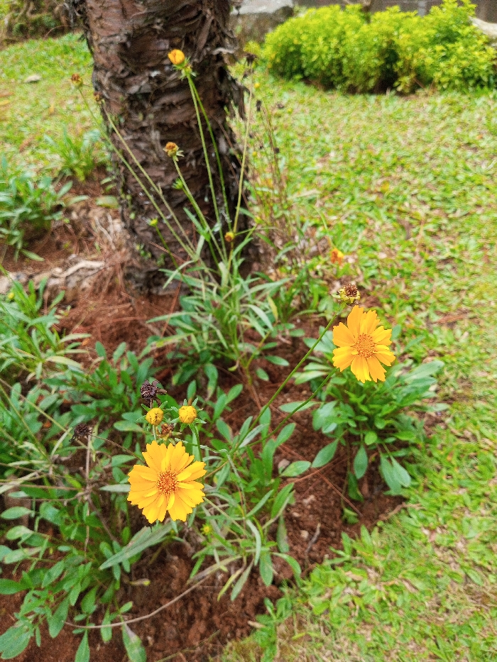 The image displays an outdoor garden scene in Orehat, India. The foreground features two yellow, multi-petaled flowers with orange-yellow centers, indicative of Coreopsis species, growing on green stems. Surrounding these are various green leafy plants and several smaller flower buds in different stages of development, some yellow-green and others brown. The ground beneath the plants and around the tree consists of dark brown soil mixed with reddish-brown organic mulch. A textured, dark brown tree trunk occupies the left side of the frame, positioned vertically. The background on the right and top consists of a green grassy area, with blurred dense green foliage or bushes visible in the upper right quadrant. No individuals, animals, or man-made structures are visible.