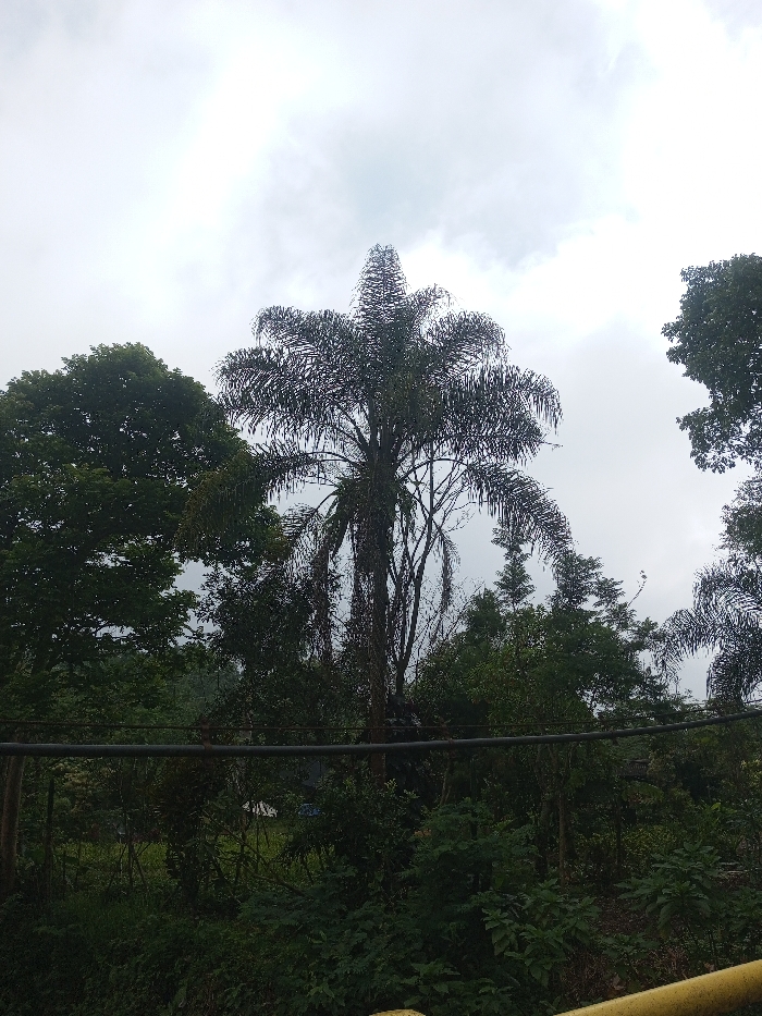 The image displays a densely vegetated outdoor scene, situated in Nuwara Eliya, Sri Lanka, under a uniformly overcast sky. A prominent, tall palm tree with a dark green, somewhat spiky and elongated crown dominates the central-right portion of the frame. Its long fronds extend outward and downward, with several dry or decaying fronds visible along the trunk. To the left, a large, dark green broadleaf tree occupies the upper-left quadrant. Additional dense, dark green foliage, including trees and undergrowth, fills the mid-ground and foreground, suggesting an untamed natural environment. A thick, dark-colored horizontal cable or pipe spans across the mid-section of the image, partially interwoven with the foliage. At the very bottom edge of the frame, a yellow metallic railing or barrier is partially visible. No individuals, discernible animals, or overt human activities are depicted. The scene is illuminated by diffused, non-directional light, consistent with the cloudy conditions.
