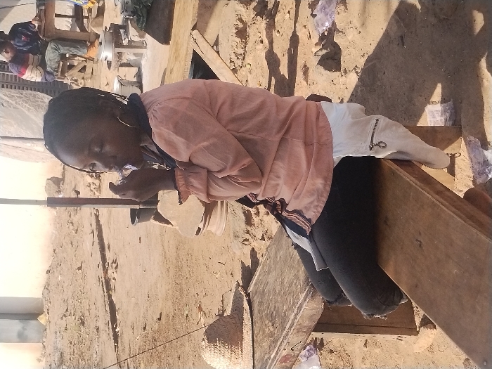 A woman kneels in a dirty outdoor area, her head bowed and hands clasped near her face. She wears a light pink shirt, black pants, and white leggings. The setting appears to be a construction site or impoverished area, with visible dirt, debris, and unfinished wooden structures surrounding her. In the background, other individuals are seated at a table. The scene's overall impression suggests prayer, contemplation, or deep sadness amidst challenging circumstances.