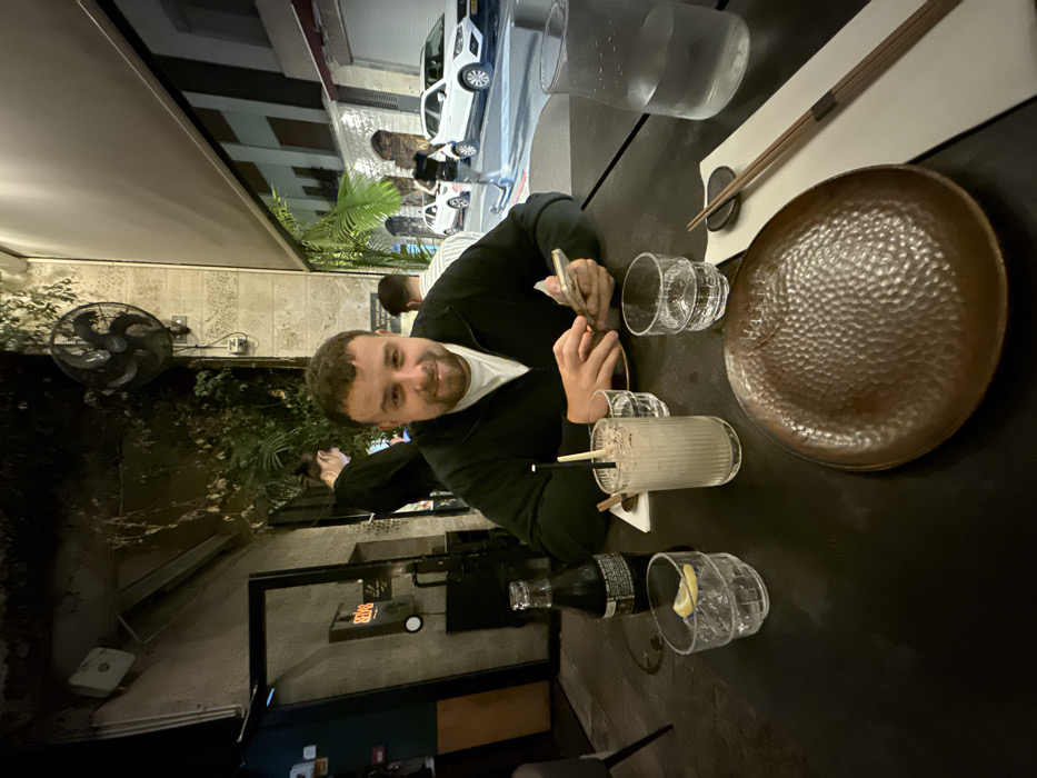 The image depicts an outdoor dining scene at night on Nahalat Binyamin Street 13, Tel Aviv, Israel, specifically at Selas Kitchen and Bar. A male individual, appearing to be in his late 20s to early 30s with short brown hair and a beard, is seated at a dark table. He is smiling directly at the camera while holding a light-colored smartphone in his right hand. On the dark tabletop, from left to right, are a dark glass Coca-Cola bottle, a clear glass with ice and a lemon wedge, a tall ribbed glass containing a light-colored beverage with a straw, and another smaller clear glass. To the right, a large clear glass carafe or tumbler filled with water is present. In the foreground right, a textured brown oval plate rests on a white rectangular plate, with dark wooden chopsticks positioned on a small black holder. In the mid-ground, other patrons are visible; one person with dark hair stands near a doorway to the left, and another person's back is visible to the right, seated at an adjacent table. The restaurant's exterior features a light-colored stone wall adorned with green foliage/vines, a black wall-mounted oscillating fan, and a vertically illuminated sign displaying "SELAS." Across the asphalt street, several white cars are parked or moving, including two SUVs, in front of older stone buildings exhibiting some arched architectural elements. A person on an electric scooter is also visible on the street.