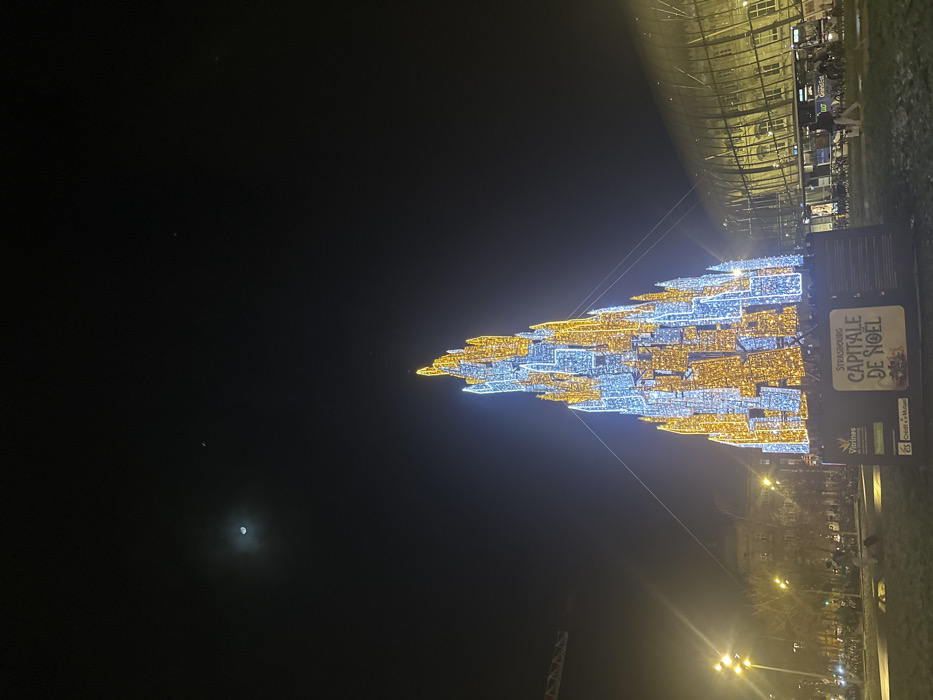 A Christmas tree made of rectangular lights, alternating between gold and blue, dominates the night scene. The tree is positioned near a building with large windows. A sign beside it reads "Strasbourg Capitale de Noël." The sky is dark, punctuated by a small, faint moon and some faint, indistinct stars. Below, streetlights illuminate the ground, suggesting an urban environment. A blurred figure can be seen walking in the building.