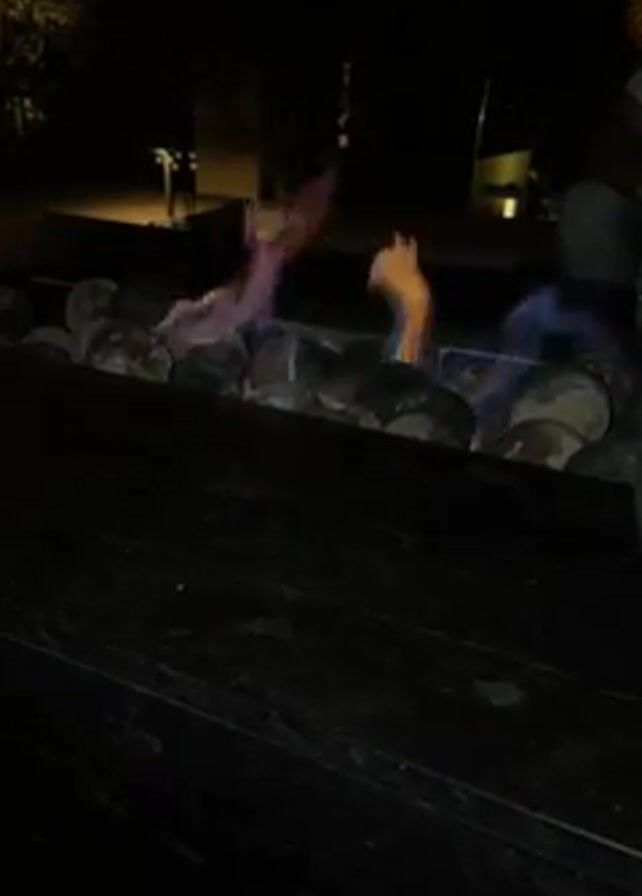 The video captures a dark scene with a rectangular fire pit as the main focus