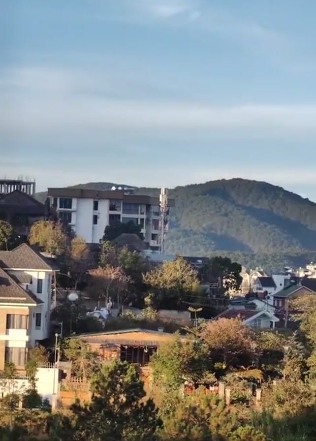 scenic view of a town nestled amidst lush greenery and rolling hills. The sky is a clear blue with a few wisps of clouds, suggesting a bright day. Buildings of varying styles, including residential houses and hotels, dot the landscape. Some structures are modern, while others have a more traditional or colonial design. Trees and vegetation fill the space between the buildings, creating a harmonious blend of nature and architecture. The terrain gradually rises towards the back, where a mountain provides a natural backdrop to the town. A sign reading "Trung Hieu Hotel" is visible. Overall, the scene exudes a sense of tranquility and natural beauty.