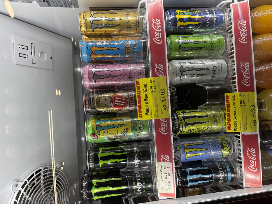 This image depicts the interior of a refrigerated display case, located within a retail establishment in Stamboliyski, Bulgaria