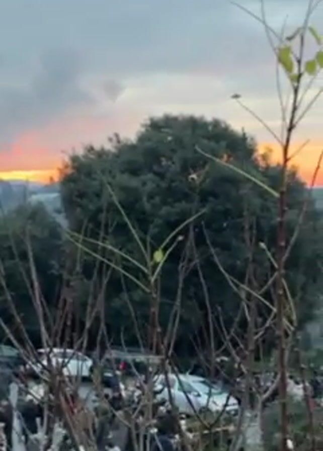 dusk or dawn scene. In the foreground, leafless branches with a few green leaves obscure the view of a parking lot. People are milling about in the parking lot. Beyond the parking lot, the landscape descends into a green valley. In the distance, a city skyline is visible, silhouetted against a sky transitioning from orange to grey. The camera slowly pans to the right, revealing more of the city.
