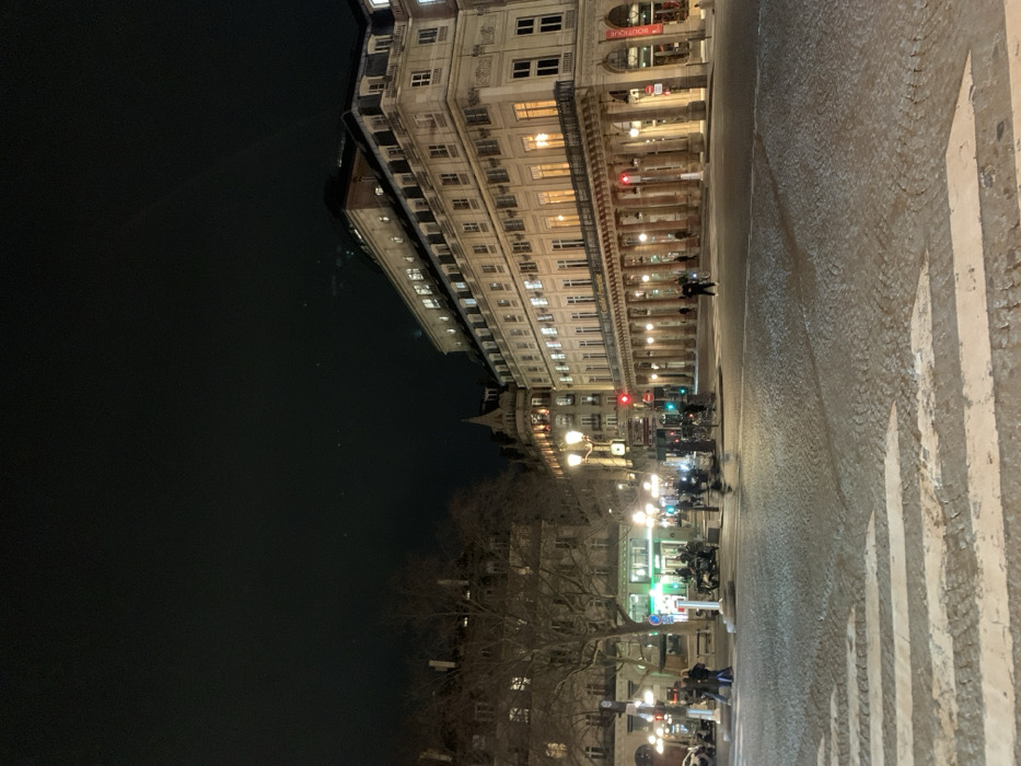 A nighttime street scene displays a grand building with numerous illuminated windows and a colonnaded walkway. Streetlights cast a warm glow on the cobblestone street and surrounding buildings. Pedestrians and vehicles populate the scene, creating a sense of urban activity. A dark expanse of water or a river appears to the left, adding depth to the composition. The image is taken at an angle, providing a unique perspective of the urban environment.