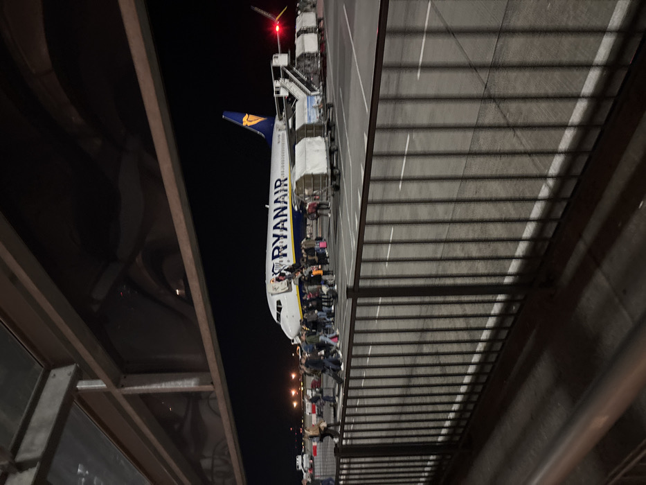 The image displays an nighttime operational scene on the tarmac at Eindhoven Airport, Netherlands. A white Ryanair Boeing 737-series aircraft, featuring blue and yellow livery with a harp logo on its tail, is centrally positioned. Mobile passenger stairs are deployed at both the forward and aft passenger doors. Approximately two dozen individuals, identified as passengers, are actively ascending the front stairs to board the aircraft, with more forming a queue on the tarmac. Additional passengers are visible near the rear stairs. Ground personnel are present, and multiple baggage carts loaded with white cargo containers are positioned around the aircraft, indicating ongoing baggage and cargo handling. A red navigation light is illuminated near the aircraft's tail. In the immediate foreground, a dark metal fence with vertical bars runs horizontally, partially obscuring the lower view. Above this fence, a horizontal support beam of an overhead structure is visible, suggesting the viewpoint is from a terminal building or elevated walkway. The background is dark, showing distant airport lighting on the airfield.