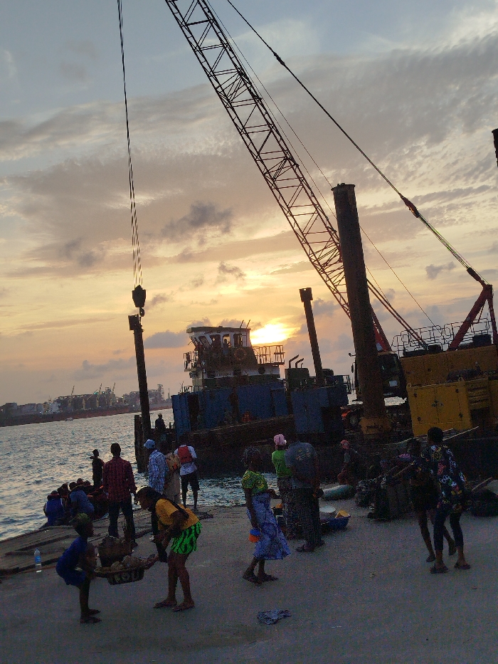 This image depicts a bustling waterside scene at sunset or sunrise, likely within a port or harbor area of Lagos, Nigeria. **Environment:** The sky features scattered clouds illuminated by the low sun on the horizon, casting a warm orange and yellow glow. A large body of water, consistent with a lagoon or ocean port, occupies the left and middle ground. A concrete dock or pier forms the immediate foreground and right side. In the distant background, across the water, several large cargo or container ships are visible. **Structures and Objects:** A prominent, tall, red and black lattice-boom crane dominates the right side of the frame, its boom extending diagonally upwards. A heavy hook assembly hangs from its cable, descending towards the water or a vessel. Partially obscured by the crane, a large blue and yellow vessel, possibly a work barge or tugboat with a superstructure, is moored or positioned near the dock. Several thick, cylindrical piles or pillars are visible, one being lowered by the crane. On the concrete dock, a discarded clear plastic water bottle is present. **People and Actions:** Approximately 15-20 individuals are visible, many silhouetted against the bright horizon. They are dressed in casual attire, including traditional wraps and modern clothing. * On the dock, in the foreground-center, an individual in a yellow top and striped shorts is bent over, possibly attending to or carrying a large basket. Another person, possibly a child, is crouched near a similar basket. * Other individuals are walking across the dock. * A group of people is gathered closer to the water's edge on the left, some appearing to be interacting with items near the water, possibly loading or unloading. * General activity suggests commerce, transport, or labor associated with the port environment.