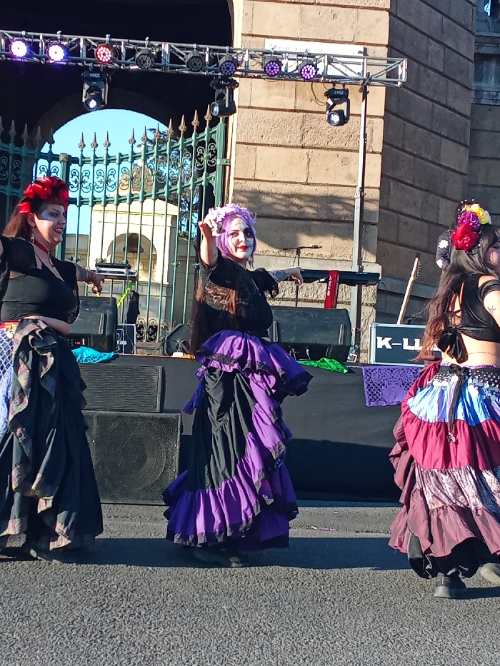 - "Three individuals in elaborate costumes are depicted performing on a temporary outdoor stage in Recoleta, Chile, positioned in front of the ornate main entrance to the Recoleta Cemetery" by FM-Luk4a2, licensed under CC BY 4.0