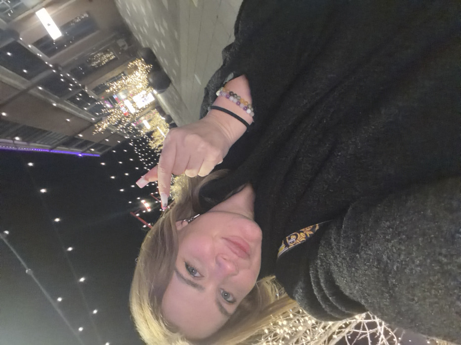 A fair-skinned adult female with blonde hair and blue-green eyes is depicted in a selfie-style photograph taken outdoors at night