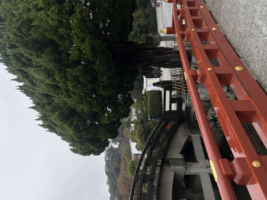 A large, old evergreen tree dominates the scene, its dark trunk twisting towards the top-left corner. The photo is taken near a traditional Japanese structure with red wooden beams and golden accents. Parts of a stone bridge are visible below the red structure. In the background, glimpses of other buildings are partially obscured by trees, creating a sense of depth. The sky is overcast, suggesting a cloudy or rainy day.