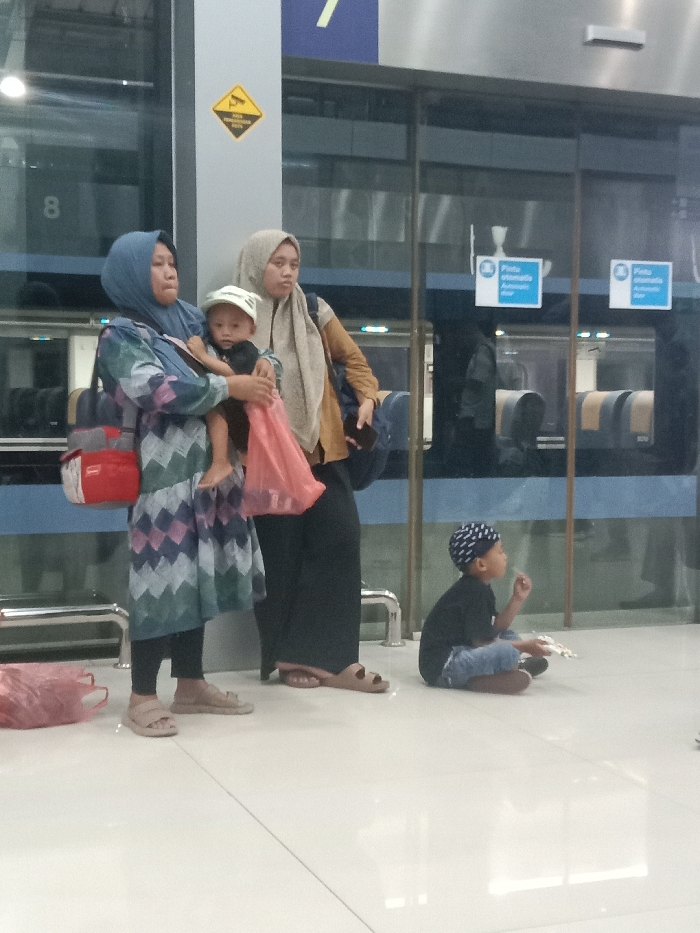 The image depicts an indoor scene at Surakarta Balapan Station, Surakarta, Indonesia, specifically near what appears to be gate or platform 7, indicated by a large blue "7" and an "Area pengawasan CCTV" sign on a grey vertical column. Four individuals are present: two adult women and two young children, standing and sitting on a clean, reflective white tiled floor in front of automatic glass doors. On the left, an adult woman wearing a blue hijab, a patterned dress over dark leggings, and beige sandals holds a toddler. The toddler wears a white cap and a dark shirt, with bare legs and feet. The woman carries a red shoulder bag and holds a transparent pink plastic bag. Standing slightly behind and to her right is another adult woman, wearing a light beige hijab, a mustard-colored top, and dark pants with brown sandals. She carries a dark blue shoulder bag and holds a dark-colored smartphone or object in her right hand. To the far right, a young boy wearing a blue and white patterned durag, a black t-shirt, and blue jeans sits cross-legged on the floor, holding a small white object near his mouth, with other small white objects on the floor beside him. The background consists of modern automatic glass doors with blue horizontal framing, labeled "Pintu otomatis" (Automatic door) with pictograms. These doors reflect the interior of a train, showing seats and windows. A partially visible red plastic bag rests on the floor in the lower-left corner of the frame. The lighting is bright and artificial, illuminating the scene and creating reflections on the floor and glass surfaces.