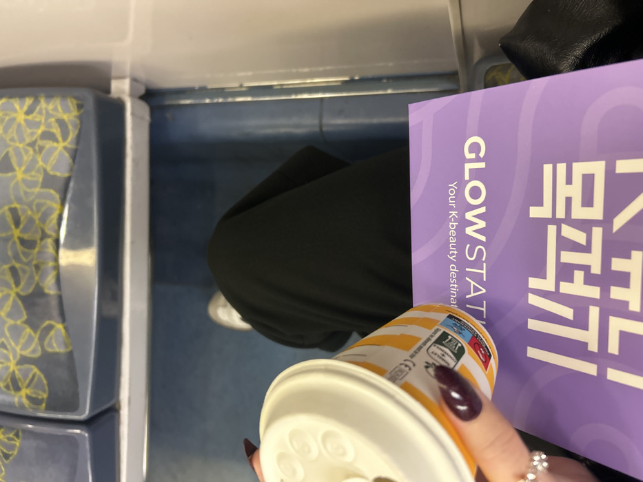 Seated, possibly on public transit, a person holds a McDonald's coffee cup. Dark pants cover their legs and a white shoe is visible. A purple brochure with “GLOWSTAT” and Korean text sits to the right. The seat has a blue and yellow patterned cushion. The person wears a flower-shaped ring and has dark, polished fingernails. The photo is taken from a top-down perspective.