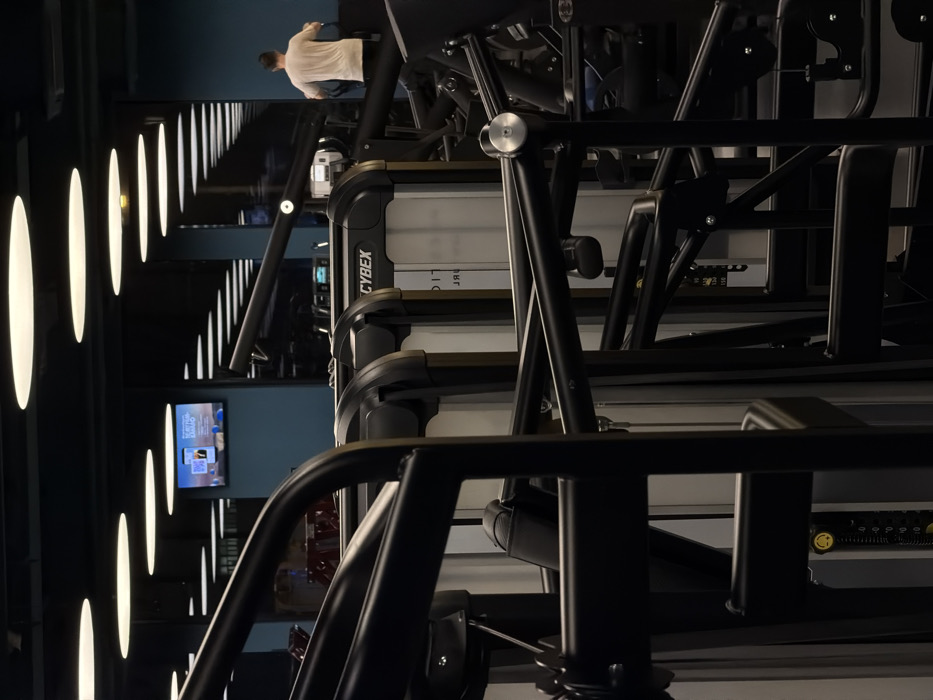 A gym interior features exercise equipment with a prominent "CYBEX" label. Black metal framing dominates the foreground, obscuring the view. A person in a white shirt and dark pants is visible in the background. Ceiling lights are arranged in a striking pattern. A television screen on the left displays content, further enriching the gym's ambience.