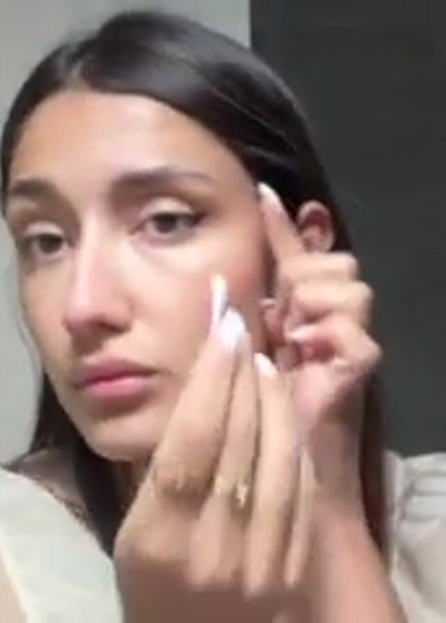 A young woman is standing in a bathroom looking at the camera and using a cotton swab to correct the eyeliner on her right eye. She is wearing a light colored top and a gold necklace. Her hair is long and dark. There is a shower door behind her and a mirror on the left.