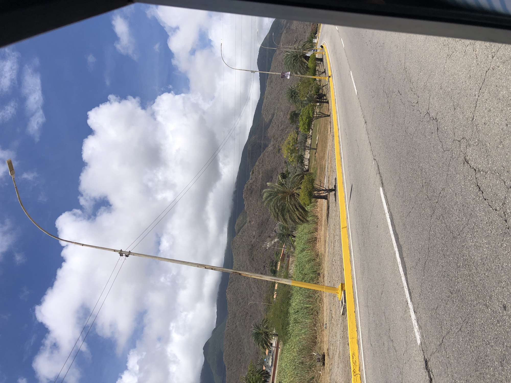The image displays a roadside scene in El Valle del Espíritu Santo, Venezuela, captured from the interior of a vehicle, evidenced by the dark frame on the right. A two-lane asphalt road, exhibiting numerous surface cracks and a continuous white lane marker, curves to the right in the foreground. This road is bordered by a yellow-painted concrete curb. Adjacent to the curb on the left, an expanse of dry, light brown ground leads to a dense stand of tall, green, reed-like vegetation or sugarcane. Beyond this foliage, a series of palm trees and other green trees are visible, with indistinct light-colored buildings in the far distance. The background is dominated by a range of arid, brown mountains, their upper slopes partially shrouded by low-hanging white clouds. The sky above is clear blue with scattered white cumulus clouds. Multiple streetlights line the road; the nearest is a tall, slightly leaning off-white pole with a yellow base, fitted with a rectangular LED luminaire and supporting overhead power lines. A dark banner is affixed to a more distant streetlight. No individuals or active vehicles are present within the visible area. The scene is illuminated by bright daylight.
