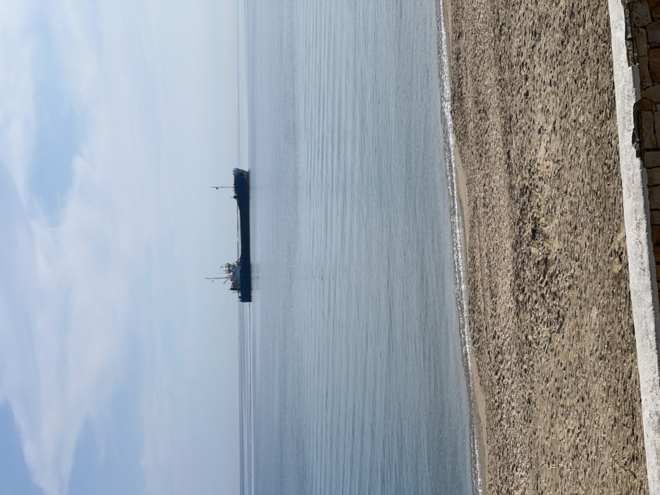 The image depicts a coastal scene in M'diq, Morocco. In the foreground, the upper section of a stone wall with a light-colored concrete cap is visible. Beyond this, a sandy beach stretches horizontally, meeting the waterline where small, white-crested waves break. The mid-ground is occupied by the calm, light blue-green sea. In the mid-distance, a dark-hulled cargo ship or bulk carrier with a superstructure located towards the stern and visible masts is underway, traversing from the left to the right side of the frame. The background consists of a clear, light blue sky featuring sparse, wispy white clouds. No individuals are present in the scene.