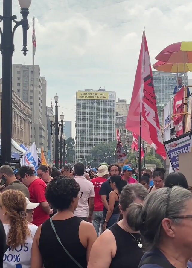 crowded street filled with people. Many are wearing white shirts that say "Somos 100% SUS." There are red and blue tents lining the street. A flatbed truck with people on top is visible, displaying flags and signs that read "Justiça para Readaptados." The environment includes street lamps, buildings, and flags. People are walking, holding signs, and congregating near the tents and truck. The overall scene appears to be a protest or demonstration.