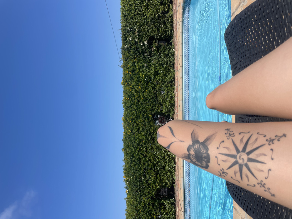 - "The image depicts a first-person view of an individual's legs extended while resting on a dark, woven lounge chair, positioned beside a rectangular swimming pool under a clear blue sky" by FM-AyUtz1, licensed under CC BY 4.0