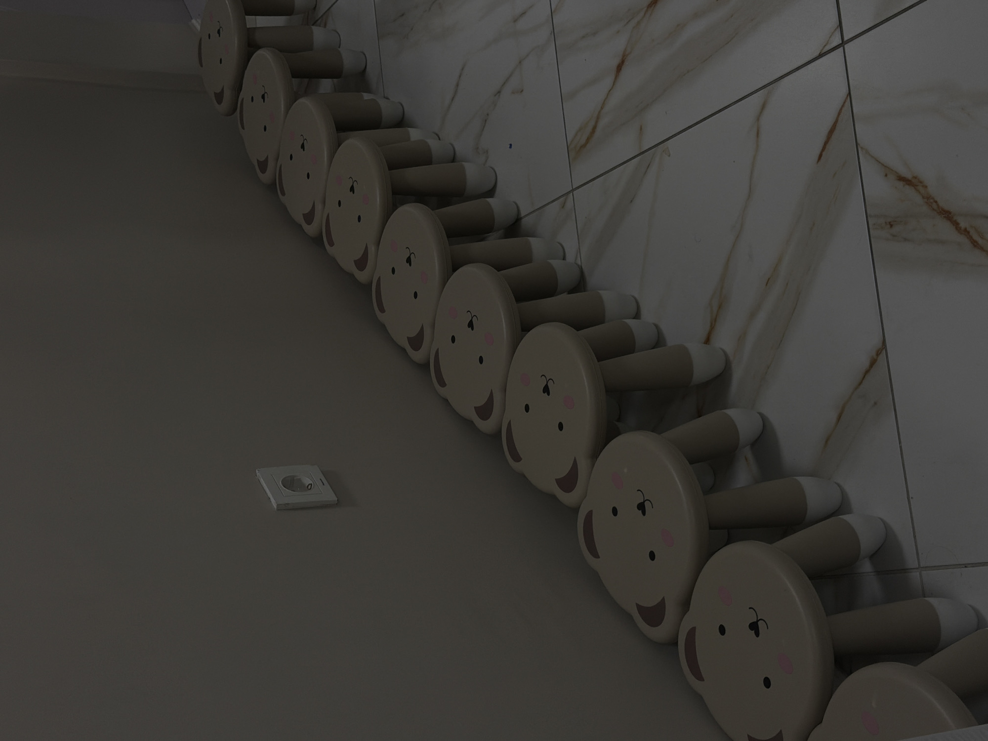 close-up of a wall-mounted coat rack featuring a series of cartoon bunny faces. The coat rack is installed on a wall made of marble tiles with brown veining. To the left of the coat rack is an electrical outlet. The environment appears to be an interior space, possibly a hallway or children's room. There are no people in the image. The location is not possible to determine based on the image.