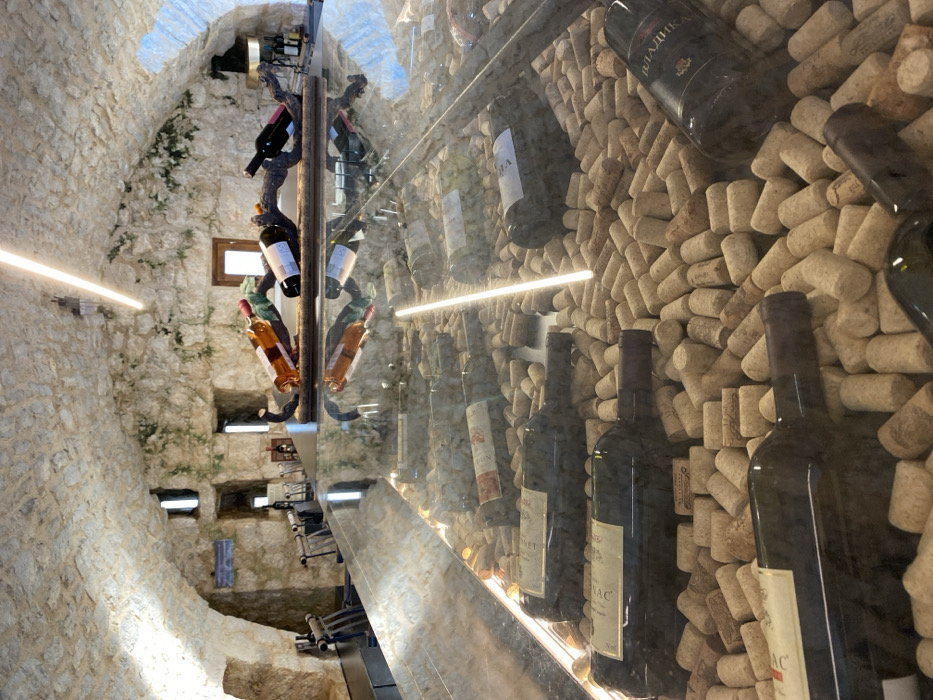 The image depicts the interior of a wine cellar or tasting room located in Boljevići, Montenegro