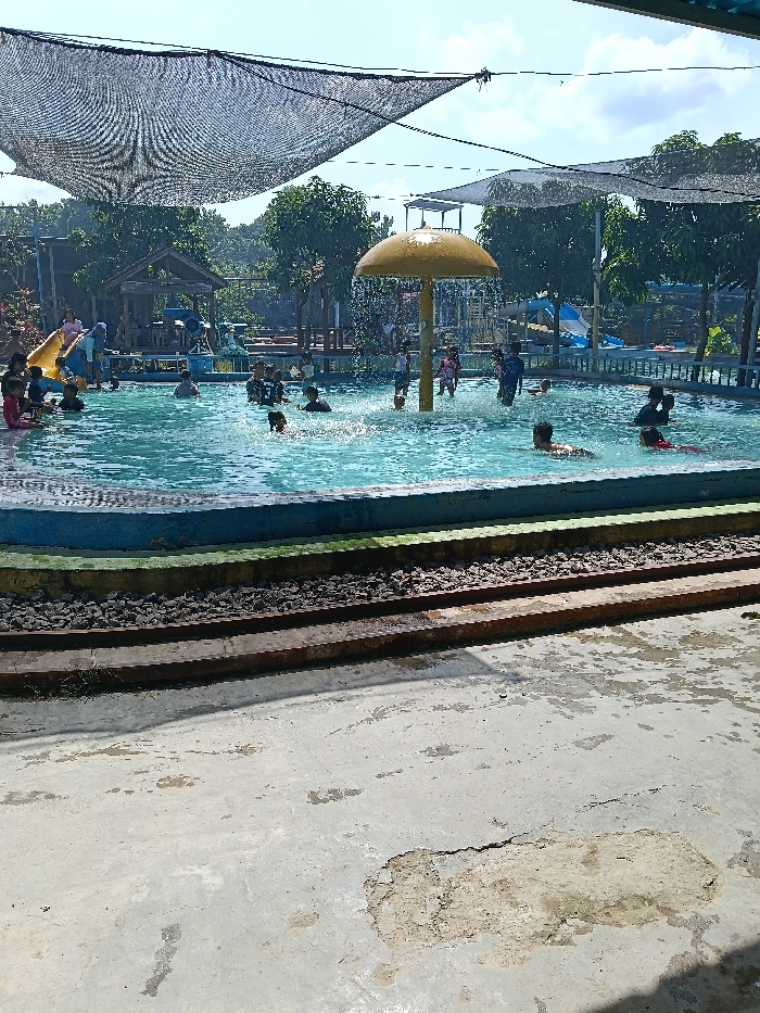 A bustling water park scene shows a pool teeming with people enjoying the water under a shaded canopy. A mushroom-shaped water feature sprays water, adding to the fun. A blue slide and a small building are visible in the background. The foreground is a concrete area with visible repairs and steps leading to the pool's edge. Train tracks border the pool area, creating a somewhat unusual juxtaposition.