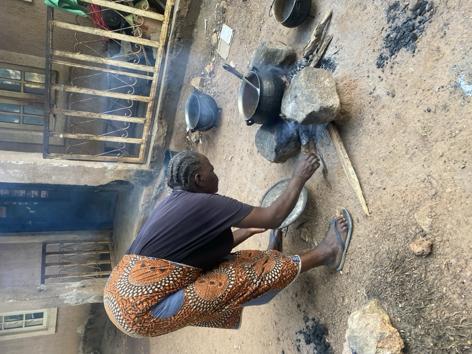An adult female is depicted outdoors in Akwanga, Nigeria, tending to an open fire for cooking