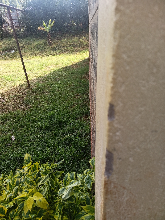 A view from a garden area focuses on a tan wall pillar on the right side. A patch of green and yellow leafy shrubs resides in the foreground. Beyond the wall, a grassy lawn stretches, transitioning from shorter to longer grass, until it meets a thick line of shrubs and small trees in the background. A small banana tree can be seen in the background. A metal structure stands in the open grass area, casting a shadow.