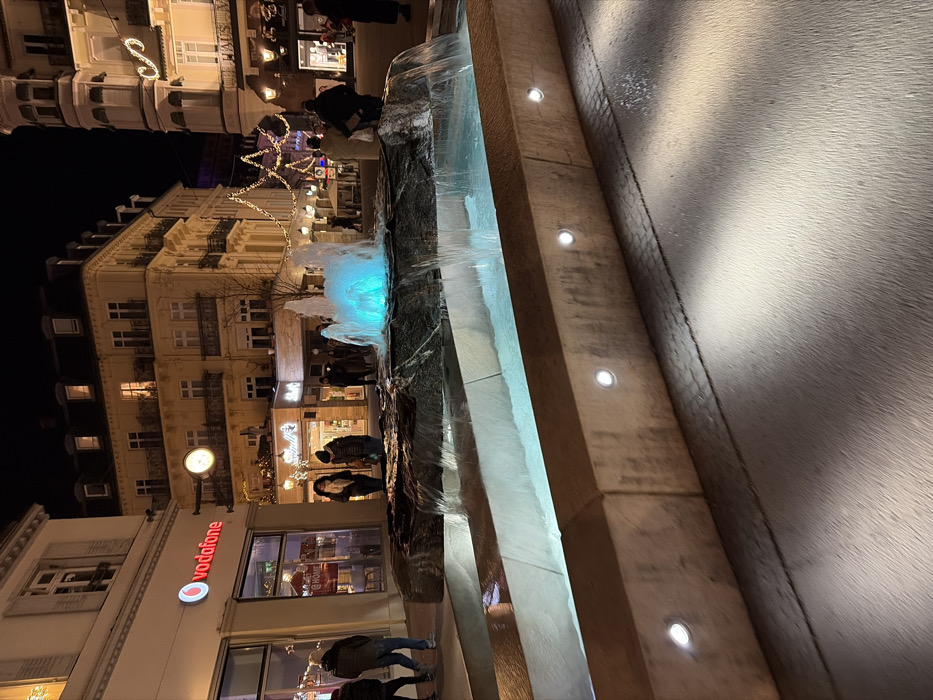 A fountain's edge stands prominently, marked with inset lights along its top. Water cascades from its dark, textured interior. In the background, buildings line a street at night, illuminated by lights and storefront signs including a Vodafone logo. People stroll along the street near the fountain. A lit decorative element hangs above the buildings. The overall scene has a cool, nighttime ambiance.