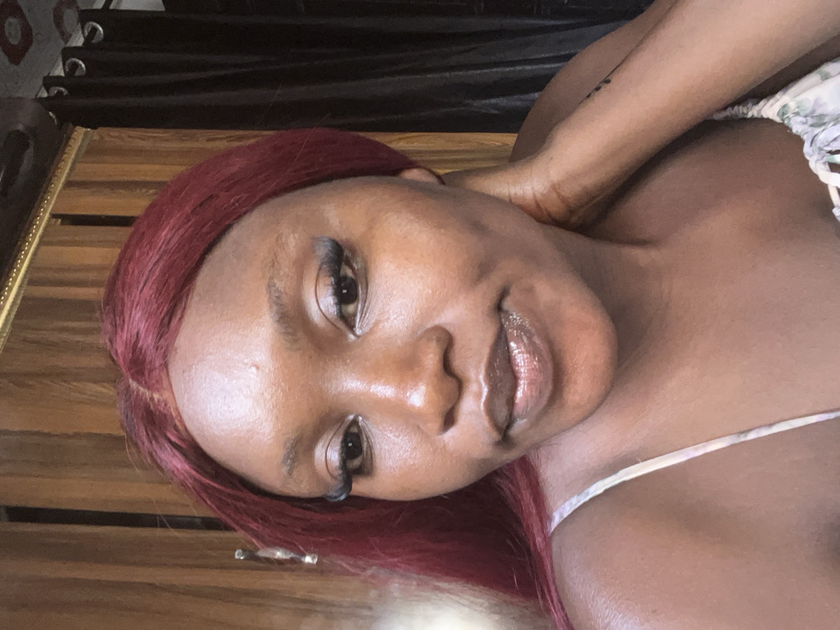 An adult female with medium-dark skin tone and long, dark red hair is depicted in a close-up, chest-up indoor portrait. She wears false eyelashes and has glossy lips. Her left hand is raised, with fingers touching the back of her neck, revealing a subtle vertical line tattoo on her left forearm. She is wearing a light-colored, patterned strap garment and gazes directly at the camera with a neutral expression. The background features a vertical brown wooden paneling with a gold-colored trim on the left, and a dark, possibly black, curtain with visible silver grommets on the right. The scene is located in Abuja, Nigeria.