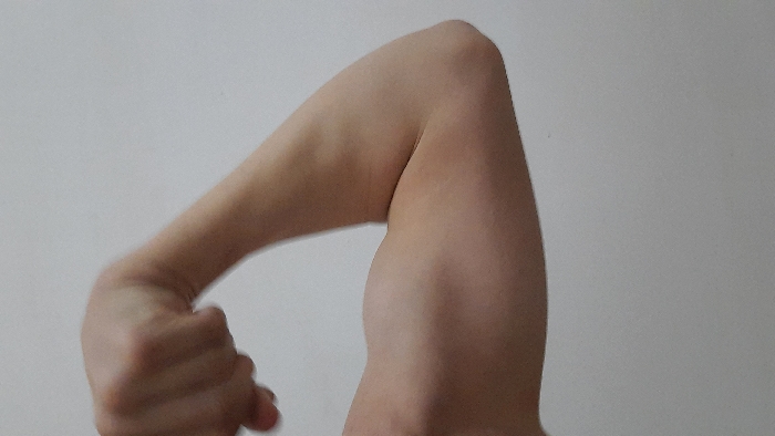The scene, situated in the city of Manghit, Uzbekistan, presents a close-up, mid-frame view of a human right arm, flexed at the elbow. The hand is formed into a fist, positioned towards the upper left. The bicep muscle is contracted and prominent. The skin tone is light. The background consists of a uniformly plain light grey wall, suggesting an indoor environment. No other subjects, objects, or specific geographical identifiers are visible within the frame.