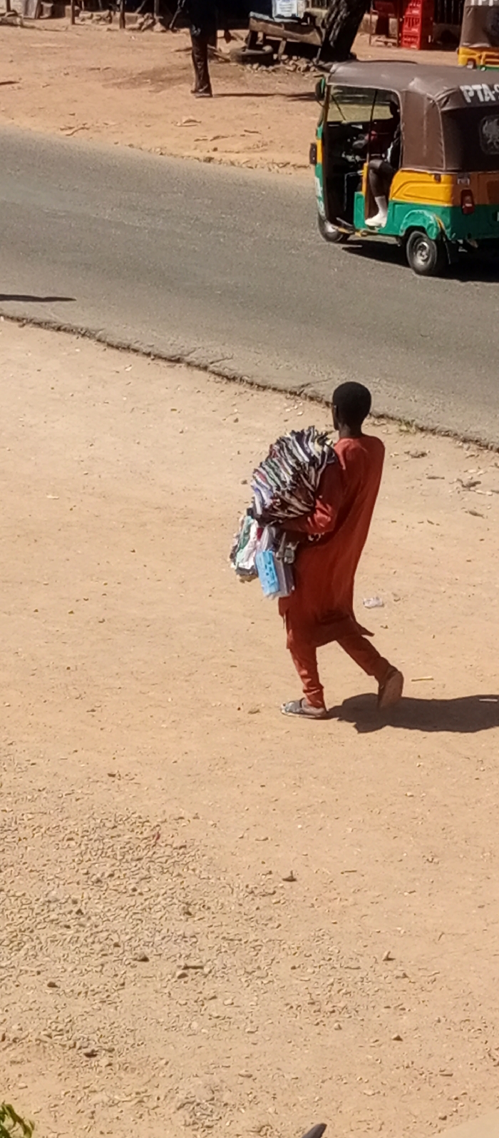 The image displays an outdoor street scene in the city of Unknown, Unknown, under clear daylight conditions. In the central foreground, a dark-skinned individual is observed walking from left to right on a light brown, gravelly dirt path. This person, seen from a three-quarter rear perspective, wears a loose-fitting, reddish-orange tunic and matching trousers, with light-colored open-toed sandals. They are carrying a substantial, multicolored bundle of folded fabric or soft goods on their left arm/shoulder, from which several smaller, distinct rectangular items are also suspended. A long, dark shadow of this individual extends towards the lower-left corner of the frame. Behind the walking individual, a two-lane asphalt road stretches horizontally across the middle of the scene. On the right side of this road, a three-wheeled motor vehicle, commonly an auto-rickshaw (or Keke-Napep), is visible. The vehicle features green, yellow, and brown paneling, with "PTA-9" partially discernable on its rear canopy. A driver wearing a white garment is seated inside. To the far left, partially obscured by the frame, the lower legs of another person, clad in dark trousers and light-colored boots, are visible standing on the dirt surface beyond the road. The background consists of a dusty environment with indistinct structures and items, including a red crate near the auto-rickshaw and various wooden elements.