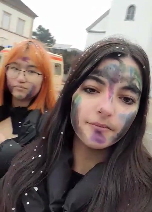 Two young women with face paint are outside. The woman in the foreground has dark hair and dark eyes and is wearing a black puffer jacket. The woman in the background has bright orange hair, glasses, and is wearing a black top. They are standing next to each other and holding up two fingers in a peace sign. Behind them are buildings and other people. It appears to be snowing.