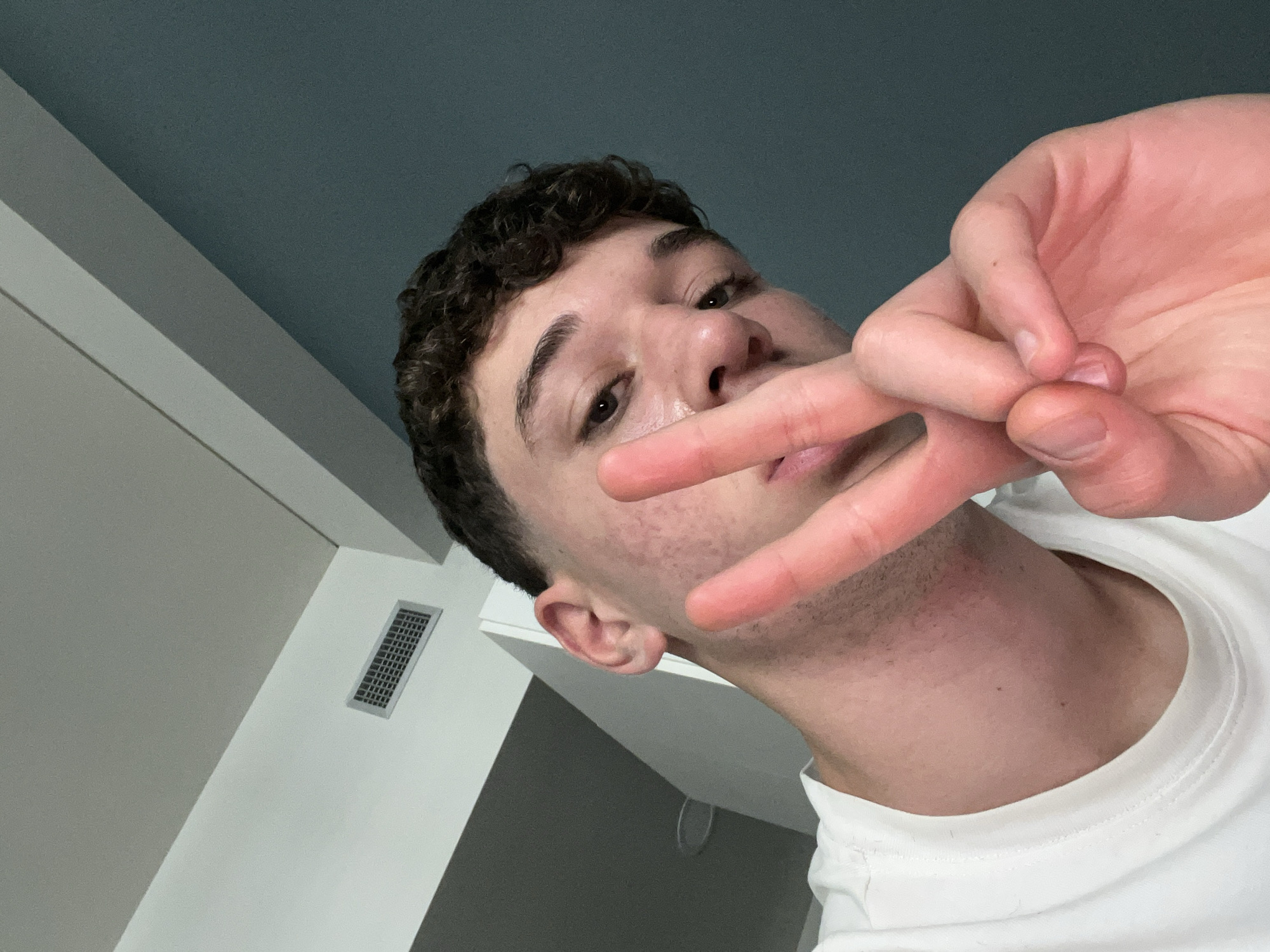 A close-up, low-angle image depicts a young male individual in an indoor setting in Turin, Italy. The male has short, dark, curly hair and fair skin, exhibiting minor facial stubble and skin imperfections. He is wearing a plain white crew-neck t-shirt. His right hand is raised, forming a "V" (peace) sign with his index and middle fingers, partially obscuring his lower face and nose. His visible left eye looks directly towards the camera. The background features a white ceiling and a white wall containing a rectangular HVAC vent. This white wall meets a distinct teal-colored wall at an architectural corner, visible on the right side of the frame.