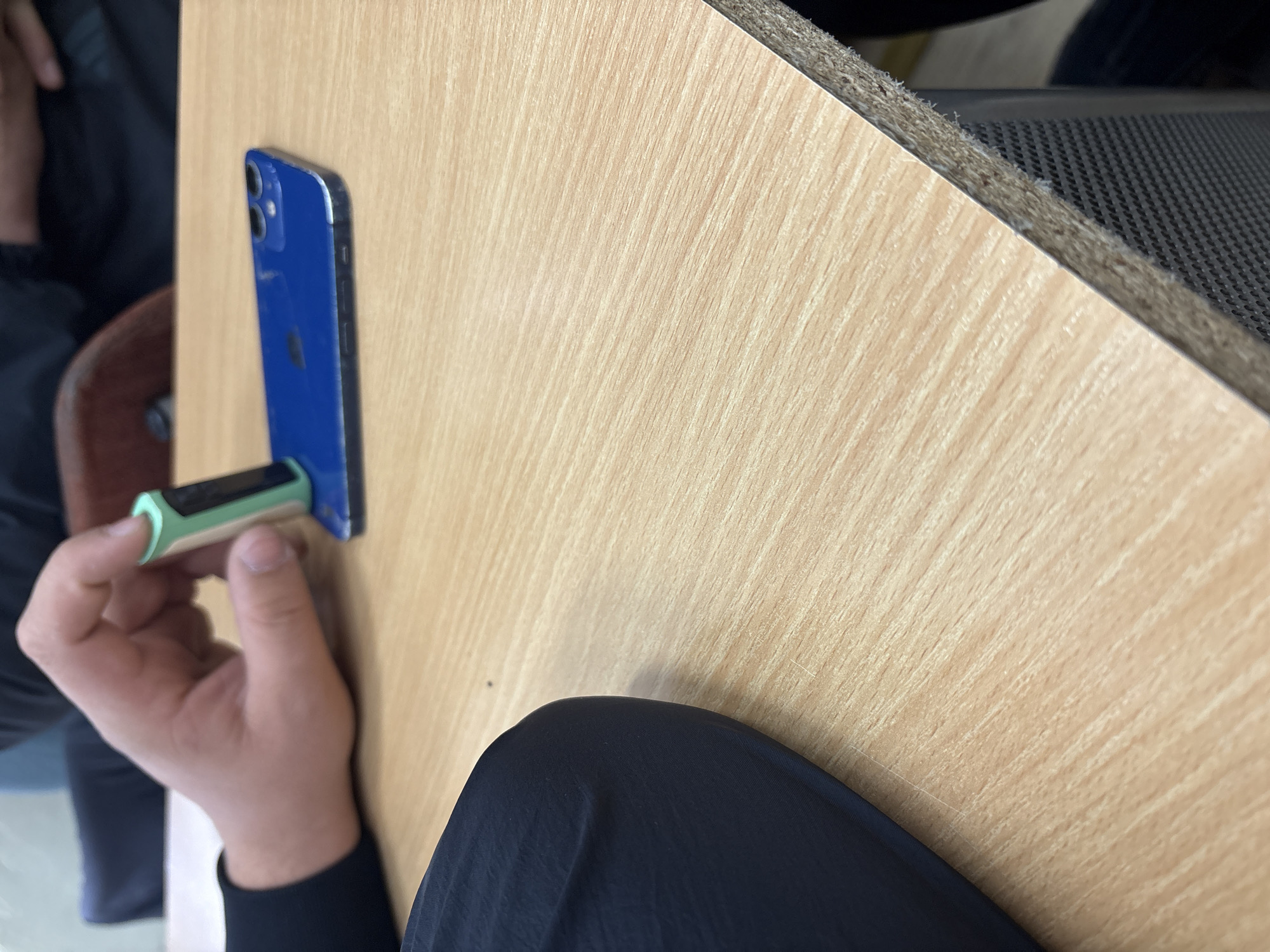A close-up image depicts a human left hand, with a light to medium skin tone, wearing a dark long-sleeved garment, holding a small, green and white fingertip pulse oximeter. The device is positioned vertically with its base resting on the back of a blue iPhone, which lies face-down on a light wood-grain laminate tabletop. The iPhone's dual camera module is visible. A portion of another individual, wearing a dark garment, is blurred in the background. The table surface exhibits a distinct wood grain pattern and a particleboard edge is visible on the right side of the frame. There is no discernible information within the image to specify the location as Goce Delcev, Bulgaria.